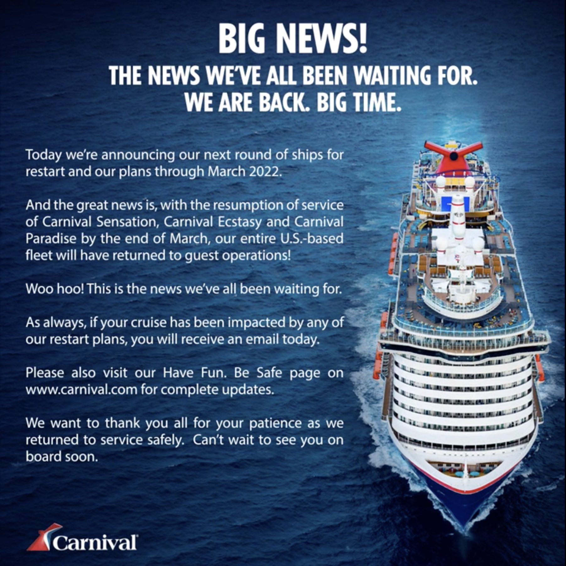 The Carnival Mardi Gras ship sails under a requirement to have 95 percent of its passengers vaccinated. CCL has over 15 of the cruise industrys worldwide market. Carnival Cruise Line announced plans for more ship restarts for January-February 2022 as the company is working towards the return of its full fleet homeporting in the USA in the Spring.